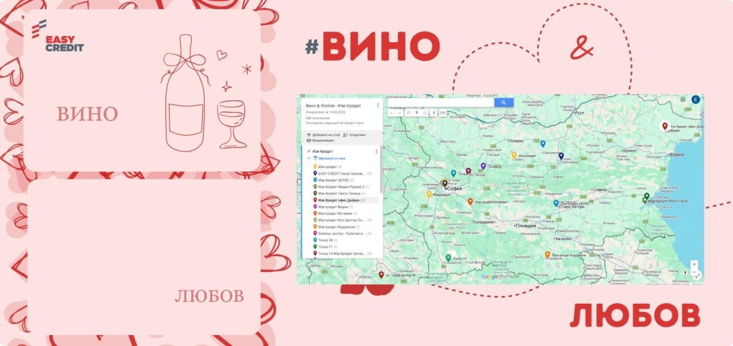 По повод деня на виното и любовта организирахме специална едноседмична инициатива „Вино и любов“, която се проведе в периода 14.02-20.02.2026 г. В кампанията се включиха колеги от цялата страна, а инициативата предостави възможност за включване по два начина: